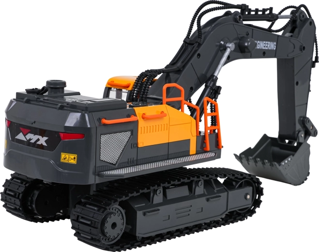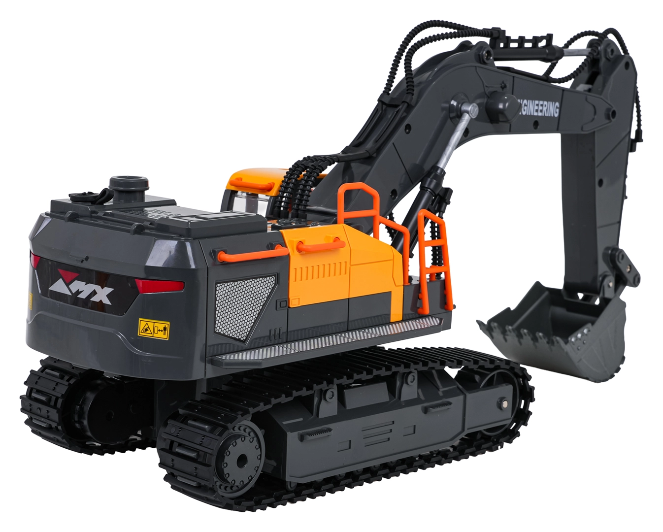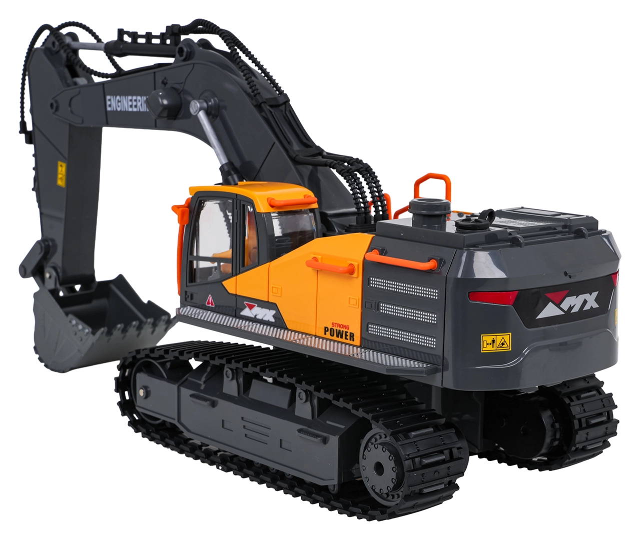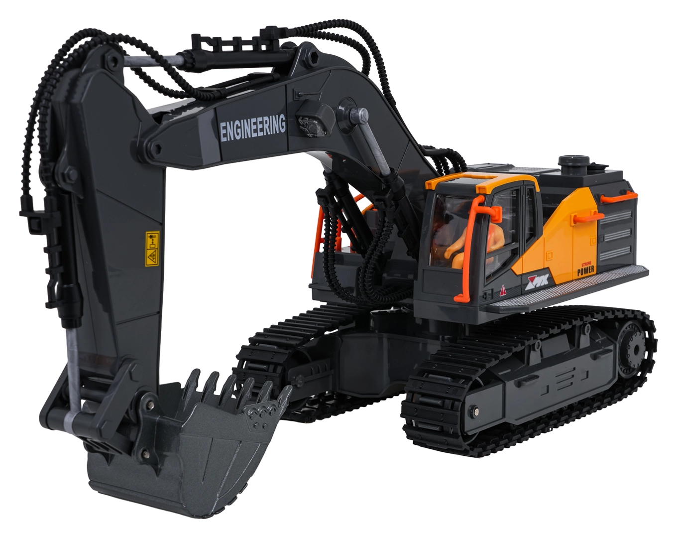 Le contrôle 2,4 GHz assure une portée stable sans interférences; la pelle avance, recule, tourne à droite et à gauche. Un mode démo, des sons de fonctionnement et de marche arrière sont disponibles, avec la possibilité de couper le son et les lumières. L’alimentation est assurée par la batterie rechargeable 3,7 V fournie; charge via USB.