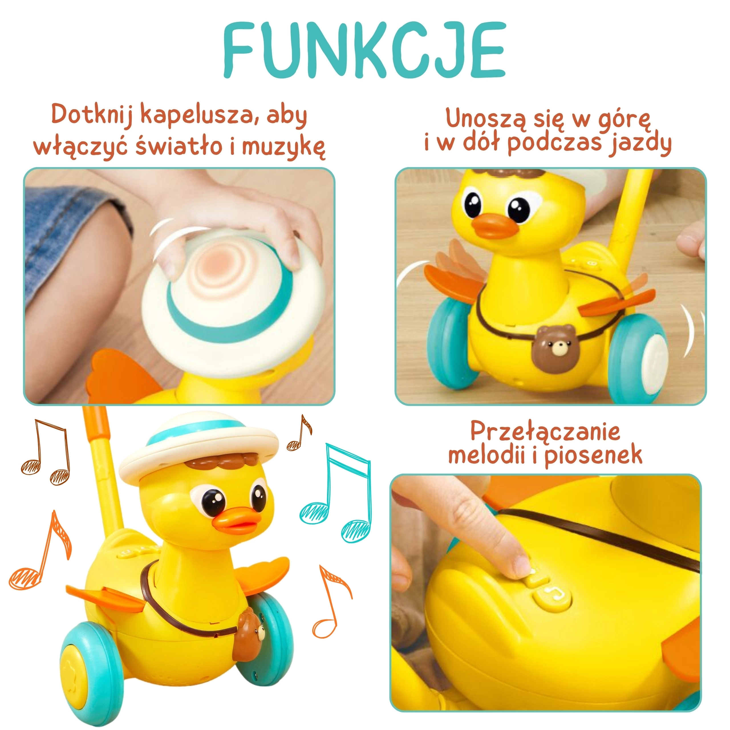 Le mignon petit canard sur tige de la marque WOOPIE transforme les premiers pas en un jeu amusant. En avançant, il bat des ailes, s’illumine et joue des mélodies joyeuses. Grâce à sa conception légère, à ses roues larges et stables et à son commande facile via boutons, les enfants l’adorent instantanément. Un excellent compagnon pour développer la motricité et l’autonomie dès 18 mois.