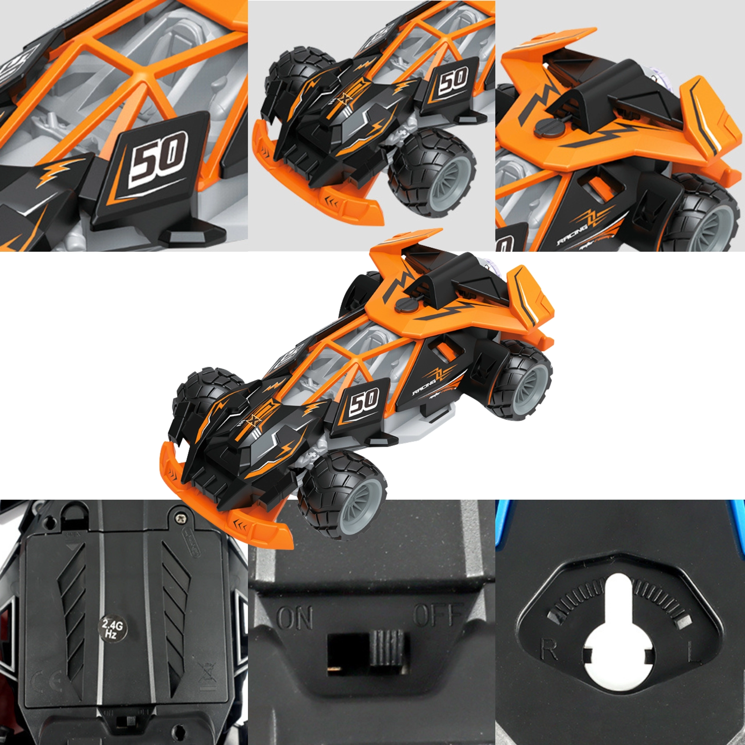 Les grandes roues tout-terrain assurent une bonne adhérence sur tapis, parquet et trottoir. La voiture est équipée d’un interrupteur ON/OFF et d’un curseur de calibration de la direction sur le châssis pour des réglages précis. Un effet arrière de type « réacteur » avec vapeur ajoute un élément visuel ludique.