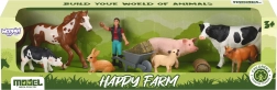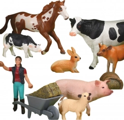 - cheval (alezan avec marque blanche), vache (noire et blanche), veau/vache (noire et blanche), veau (brun roux), cochon (rose clair), mouton/agneau (clair), lapin (brun roux), figurine de fermière, brouette, botte de foin