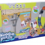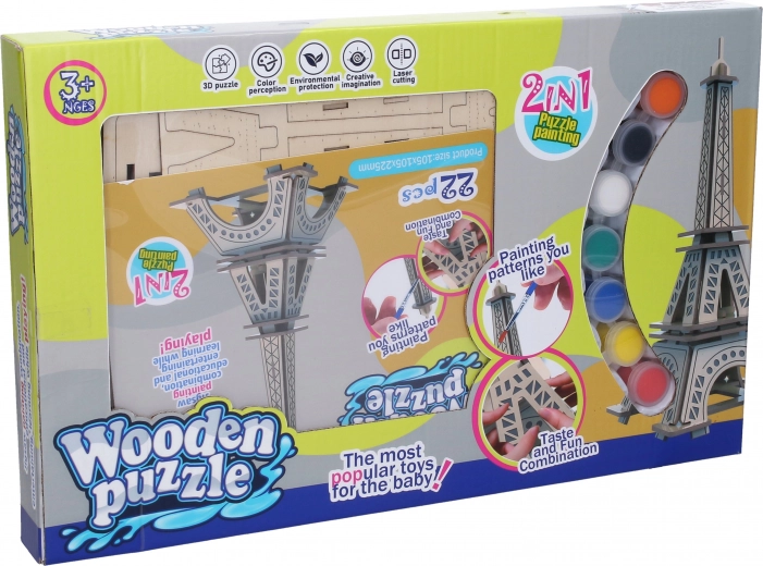 Construisez votre propre miniature du célèbre monument : puzzle 3D en bois TOUR EIFFEL avec set de peintures et pinceau. Assemblage facile, peinture créative et divertissement pour enfants et adultes. Dimensions une fois assemblé : 10,5 × 10,5 × 22,5 cm.