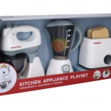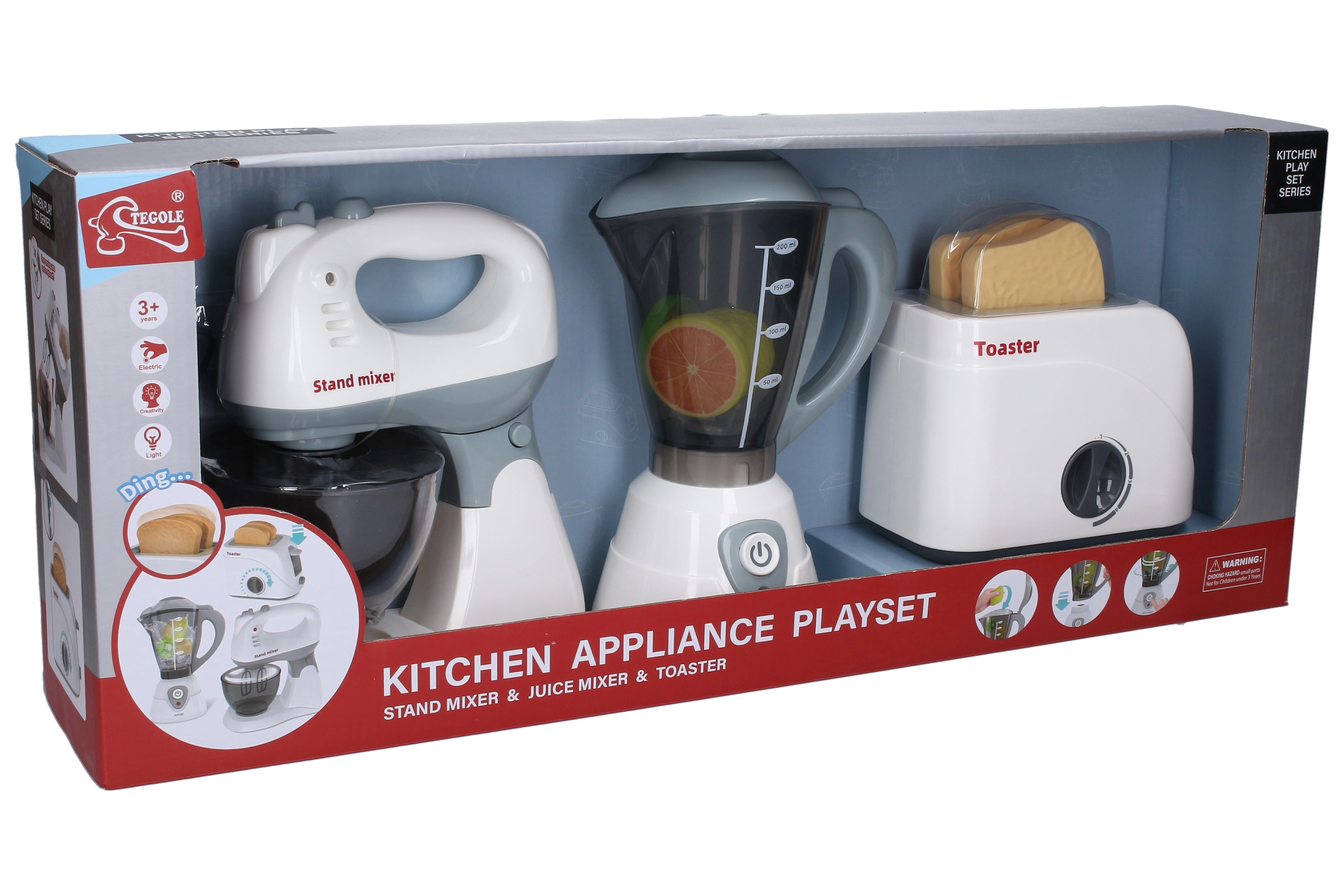 Découvrez un amusant set d’électroménagers de cuisine pour enfants aux fonctions réalistes, qui rapproche les enfants du monde de la cuisine. L’ensemble comprend un mixeur avec bol amovible, un grille-pain avec minuterie et un batteur avec fouets interchangeables. Les effets lumineux et les éléments fonctionnels comme les interrupteurs on/off, l’éjection des toasts ou les pièces amovibles garantissent des heures de jeu créatif et sécurisé.