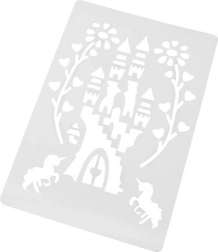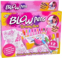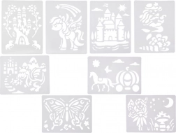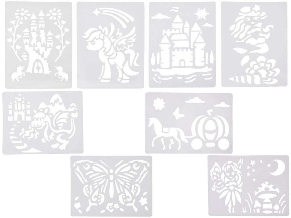 Le coffret comprend des pochoirs en plastique réutilisables avec des motifs appréciés (p. ex. papillon, châteaux, dragon, sirène, cheval avec carrosse, fée des bois, cheval/poney), 12 feutres colorés, 10 feuilles de papier et une pompe magique. Après utilisation, laissez simplement sécher les pochoirs et créez à nouveau.