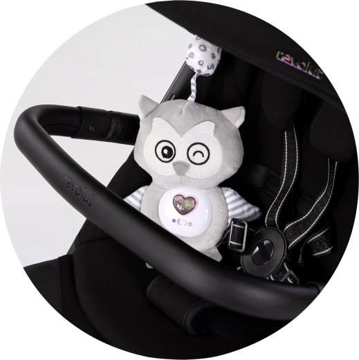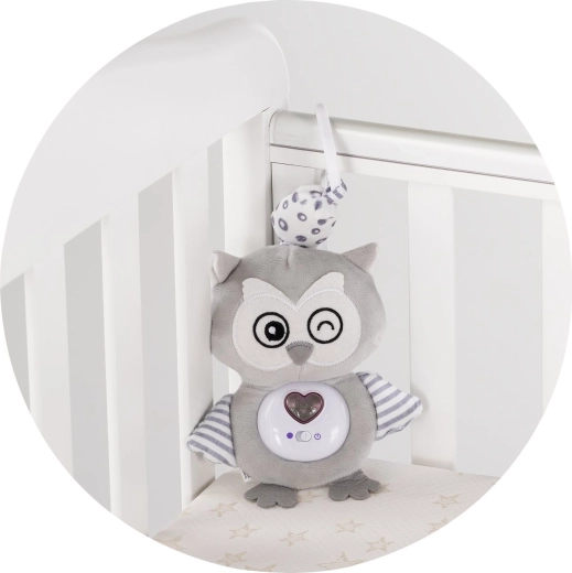 Grâce à la sangle pratique, le hibou se fixe rapidement à la barre de la poussette ou au bord du lit – toujours à portée de main.