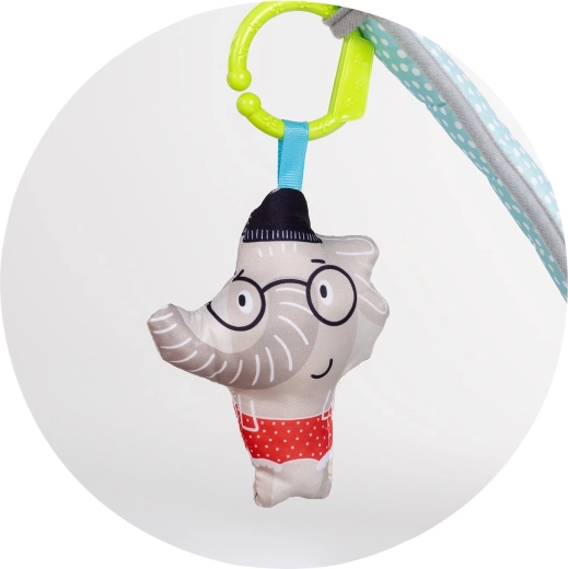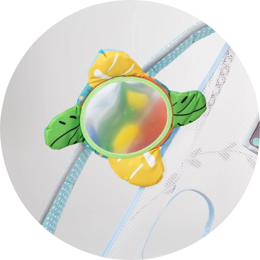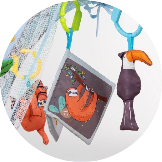Les jouets suspendus, le miroir et les effets sonores et lumineux stimulent la vue, l’ouïe et la curiosité, et incitent bébé à bouger et à attraper.