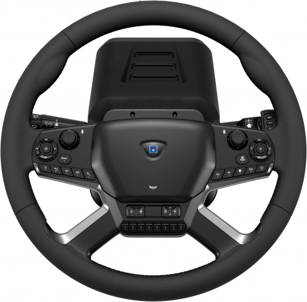 Volant de 40 cm de diamètre avec revêtement en similicuir et amplitude de 1800°, offrant une sensation authentique de conduite de poids lourds sur route et dans le dépôt.