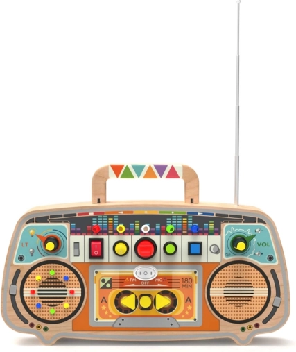 Découvrez le ludique radio FM en bois qui capte réellement des stations et fait briller les yeux des enfants. Il combine un véritable radio FM, un panneau LED lumineux, des boutons, molettes et curseurs pour développer la motricité fine, la perception sensorielle et la créativité. Grâce à une poignée pratique, il est idéal en déplacement comme dans la chambre d’enfant.