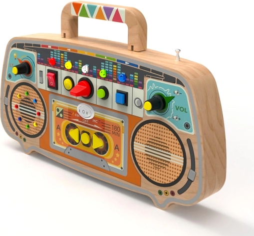 Ce tableau d’activités en bois au style radio rétro associe l’écoute réelle de stations FM à un jeu interactif. Les enfants peuvent tourner les molettes, actionner des leviers, faire glisser des curseurs et admirer les lumières colorées du panneau LED. Ils vivent ainsi une expérience stimulante qui développe la coordination œil-main, l’oreille musicale et la perception des couleurs et des formes.