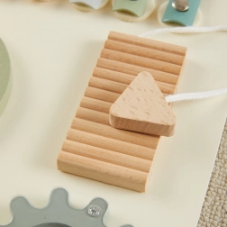 Xylophone, engrenages, labyrinthe, éléments coulissants et à ouvrir, perles et petites portes à surprise – tout invite les enfants à explorer et développe motricité fine et logique.