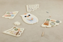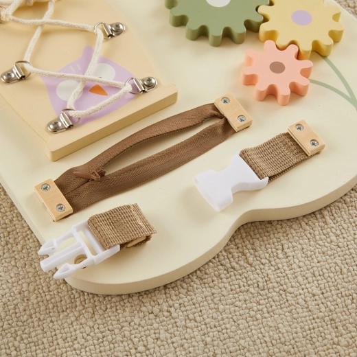 - Plus de 10 activités : xylophone, miroir, labyrinthes, engrenages, curseurs, verrous et petites portes, enfilage et éléments magnétiques.