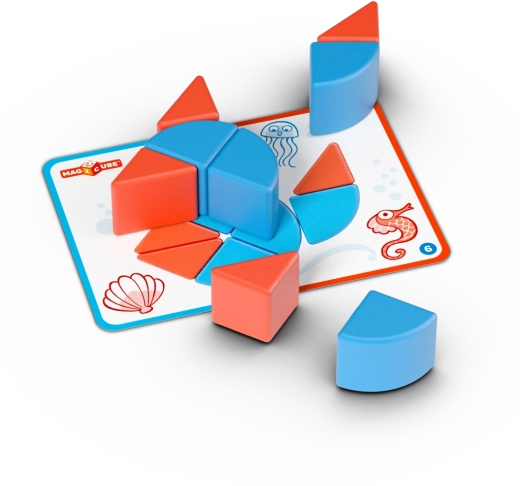 Découvrez le jeu de construction magnétique GEOMAG MAGICUBE pour les plus petits, avec un total de 16 pièces. 10 éléments magnétiques et 6 cartes recto-verso avec 12 modèles aident les enfants à assembler facilement des images, des plus simples aux plus complexes. Les gabarits sont à l’échelle 1:1 pour un positionnement pratique. Fabriqué en plastique 100 % recyclé, convient aux enfants à partir de 2 ans et développe à merveille l’imagination et la créativité.