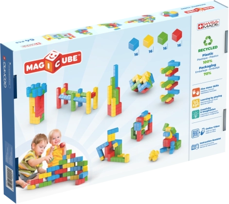 Découvrez la création en 3D avec les cubes magnétiques GEOMAG MAGICUBE. Grâce à une structure interne spéciale, les cubes s’attirent sur leurs six faces, restent solidement assemblés même en suspension et permettent un assemblage simple et sûr dès 1 an. Le coffret contient 64 cubes en 4 couleurs en plastique 100% recyclé, fabriqués en Suisse.
