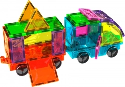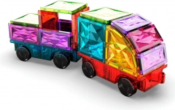 Deux châssis avec essieux et roues transforment les éléments magnétiques en voitures, remorques et autres modèles mobiles qui roulent réellement.