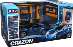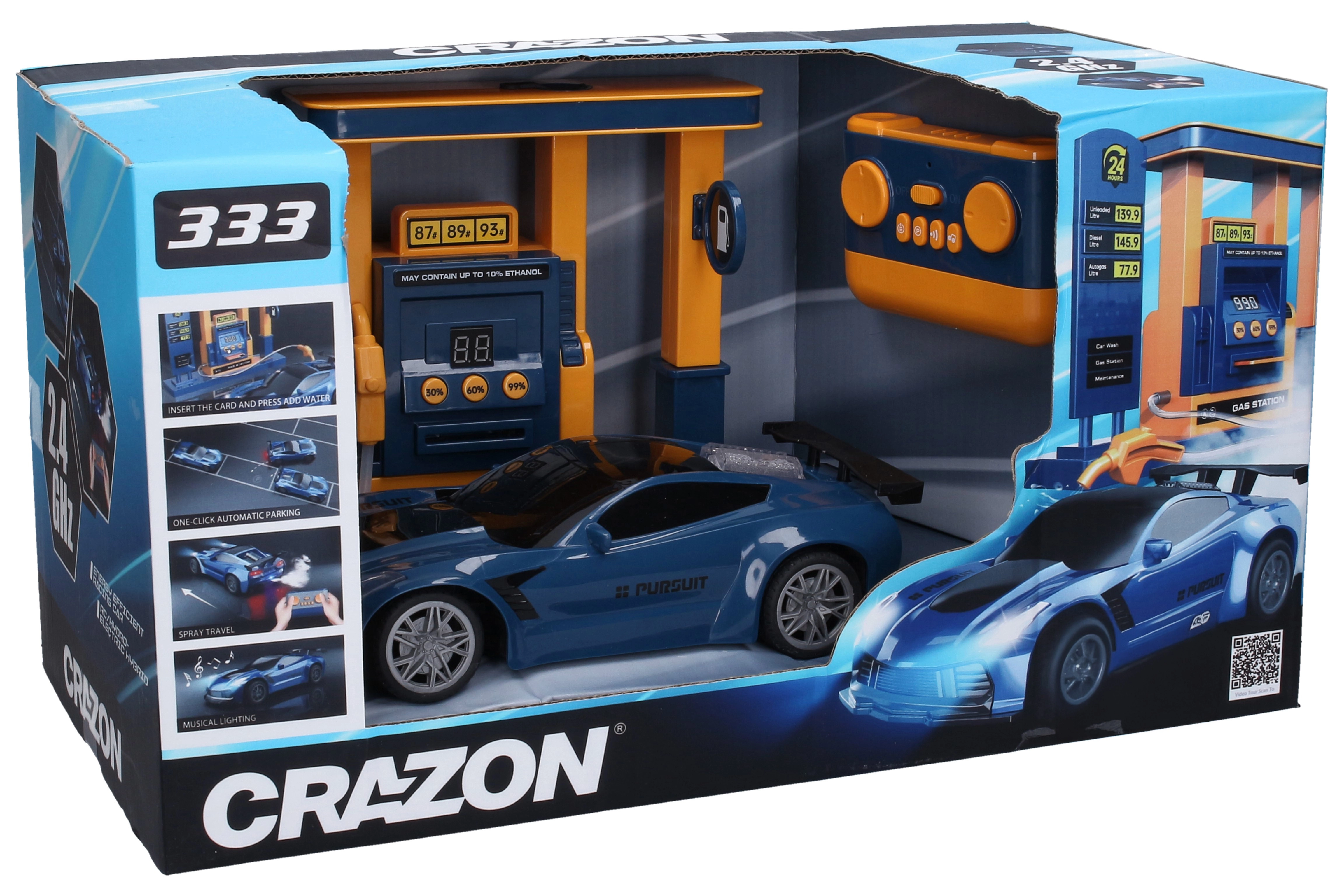 La télécommande dispose d’un interrupteur ON/OFF, de boutons pour les effets lumineux et fumée, le stationnement automatique et les effets sonores. La station-service sert de réservoir d’eau et, à l’aide du « pistolet » (flexible), vous remplissez la voiture. Pour le remplissage, insérez simplement la carte dans la station et maintenez l’un des boutons 30 % / 60 % / 90 % pour faire le plein.