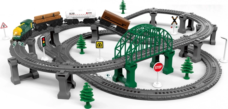 Ce set de train apporte aux enfants des heures de jeu créatif. Grâce aux wagons reliés magnétiquement, la manipulation est simple et sûre. Sur la locomotive, vous trouverez des boutons de commande pratiques – le bouton central sert de ON/OFF, et les boutons latéraux déterminent le sens de marche. Une section spéciale de la voie active des effets sonores qui rendent le trajet plus authentique.