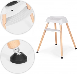 Le harnais 5 points, l’entrejambe de sécurité et les pieds en bois stables avec embouts antidérapants protègent l’enfant contre le glissement et garantissent une stabilité maximale.