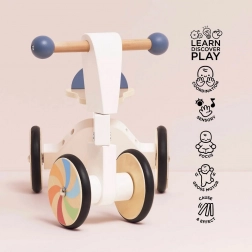 Ce moyen de déplacement stylé est retouché à la main avec des peintures écologiques à base d’eau et répond aux normes de sécurité les plus strictes. Les roues arc‑en‑ciel en caoutchouc souple assurent une conduite silencieuse et respectueuse des sols. La draisienne favorise le mouvement actif, les compétences cognitives et le jeu imaginatif.