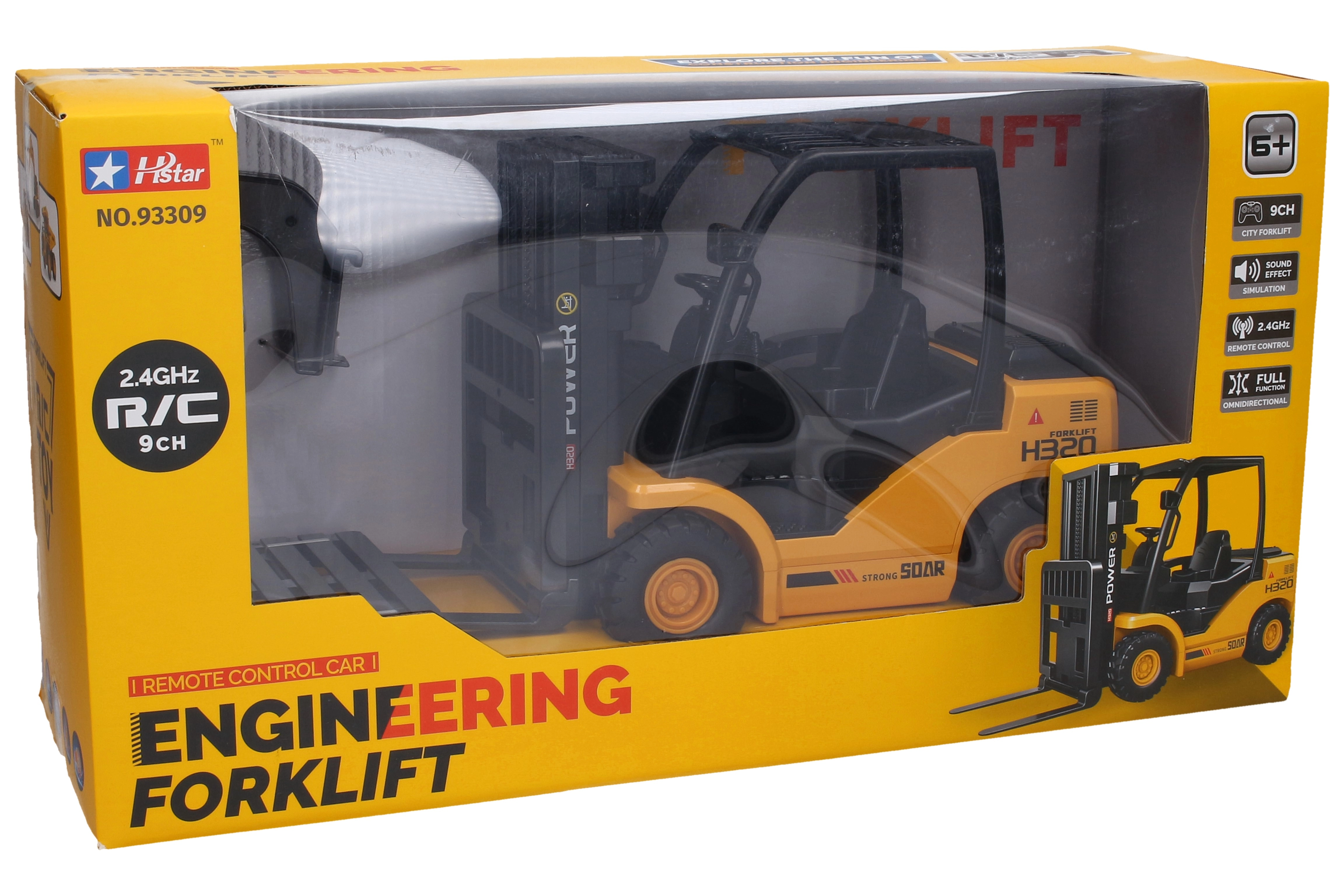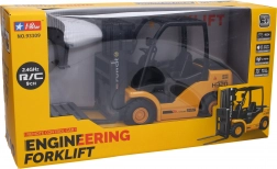 Le modèle est doté d’effets sonores avec possibilité de coupure, d’un interrupteur ON/OFF clair et d’un mode DEMO pratique. La boîte contient une palette et un adaptateur avec crochet pour déplacer facilement la charge. Le bloc batterie 3,7 V pour le modèle est inclus, il suffit d’ajouter 2× piles AA dans la télécommande.