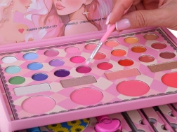De riches collections de fards à paupières, de blushs et de gloss disposées dans des godets bien visibles inspirent la créativité et développent la motricité fine.
