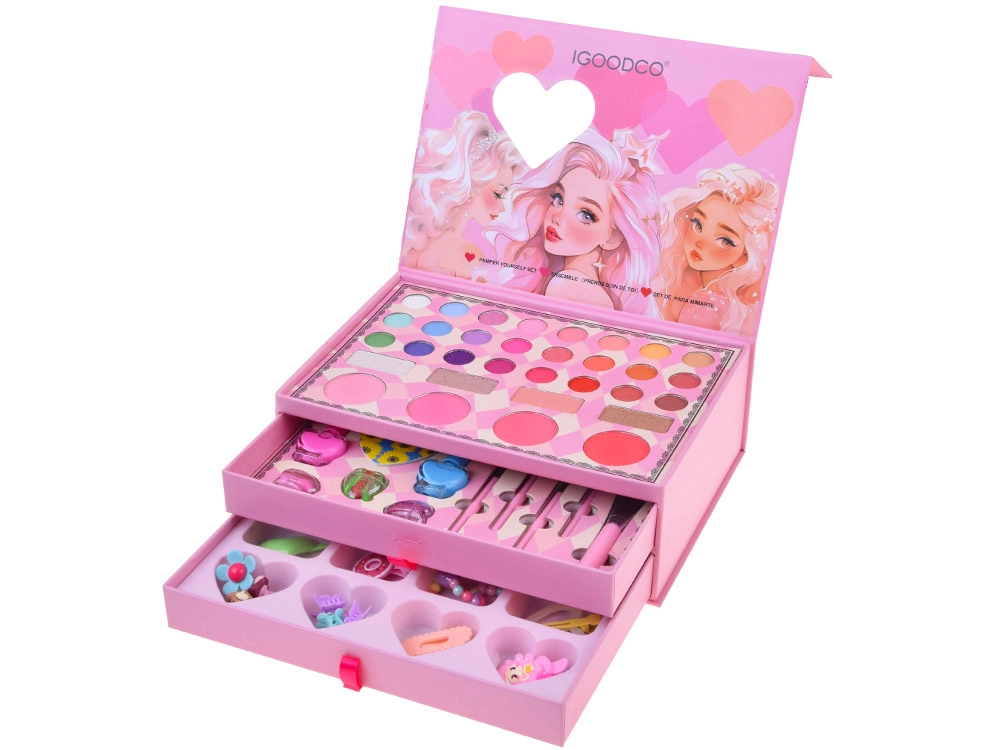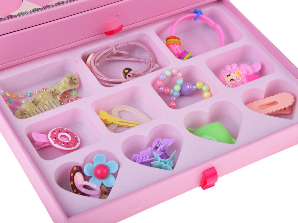 La valisette rose élégante, avec petit cœur ajouré et adorables illustrations, s’ouvre sur plusieurs étages et transforme toute chambre d’enfant en mini salon de beauté. Le plateau supérieur offre une palette variée de fards, blushs et paillettes pour laisser libre cours à l’imagination. Dans les tiroirs, vous trouverez à la fois des pinceaux, vernis, lime et séparateur pour ongles, ainsi que de magiques élastiques, barrettes, bagues et bracelets pour parfaire la tenue.