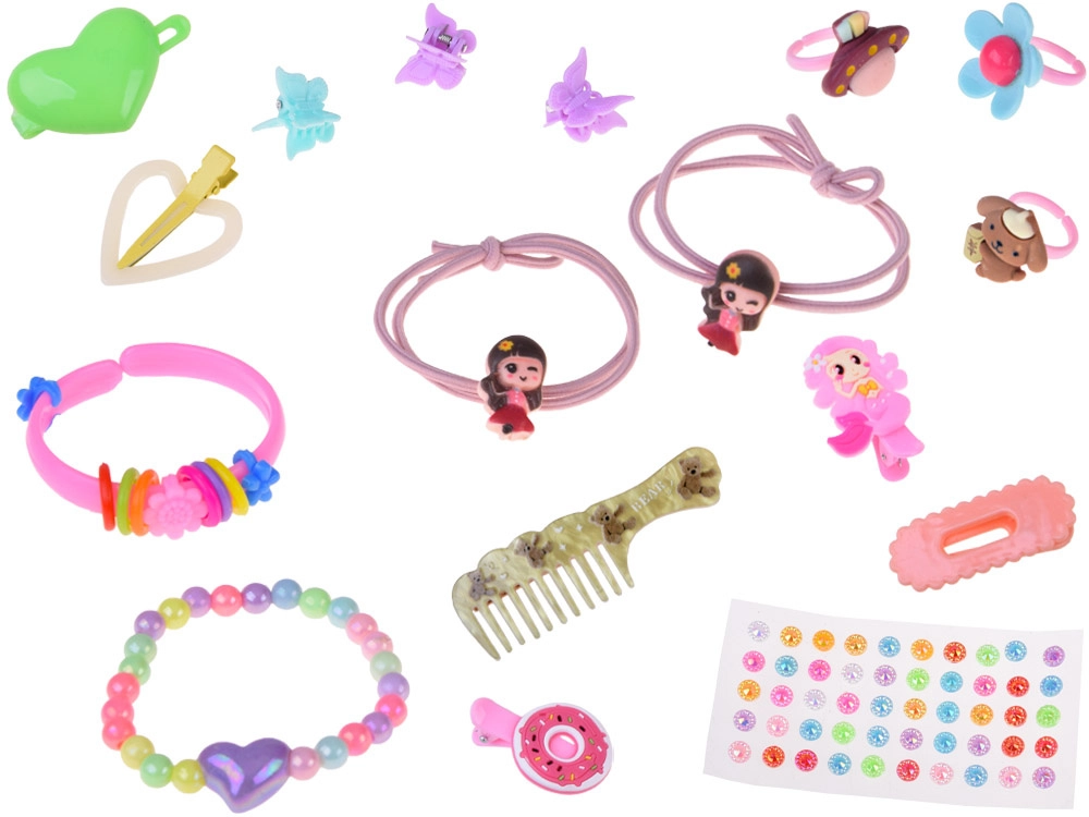 Élastiques, barrettes, pinces papillon, bagues, bracelets et strass autocollants complètent chaque look dans les moindres détails.