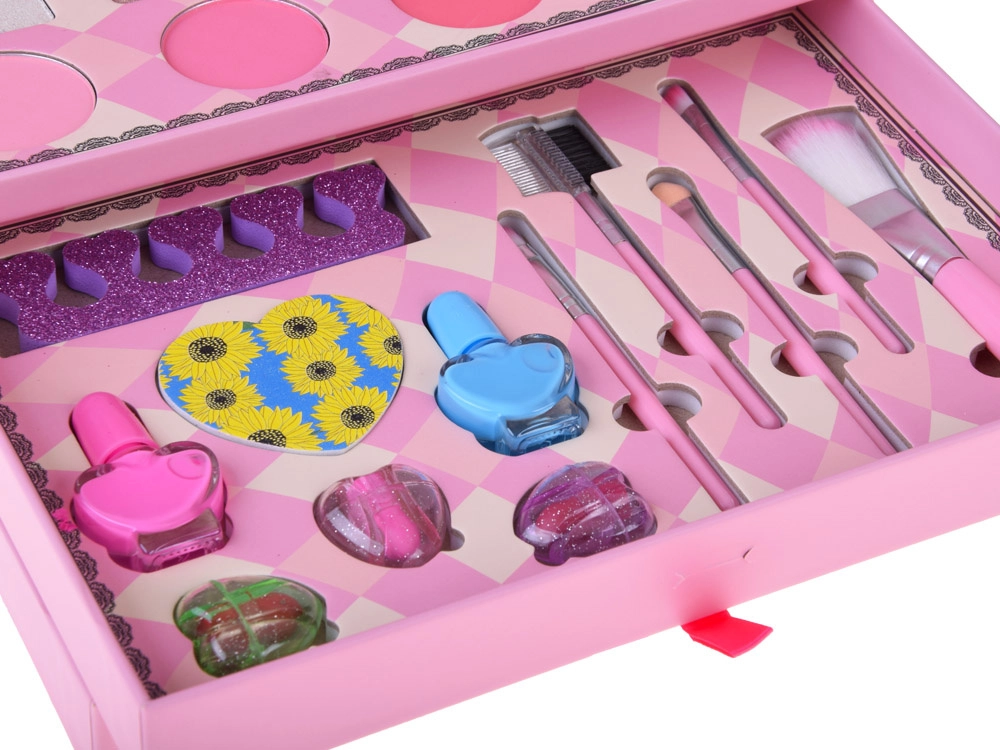 Tout est disposé de façon claire, facilement accessible et adapté à un jeu d’enfant en toute sécurité sous la surveillance d’un adulte. Grâce au riche assortiment et à l’organisateur à plusieurs niveaux, les enfants apprennent les bases du soin de l’apparence, développent leur créativité et leur motricité fine. La valisette se ferme par aimant et, avec ses dimensions de 24,5 × 17,5 × 8,5 cm, se range et se transporte aisément.