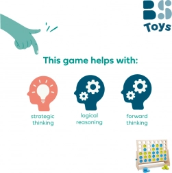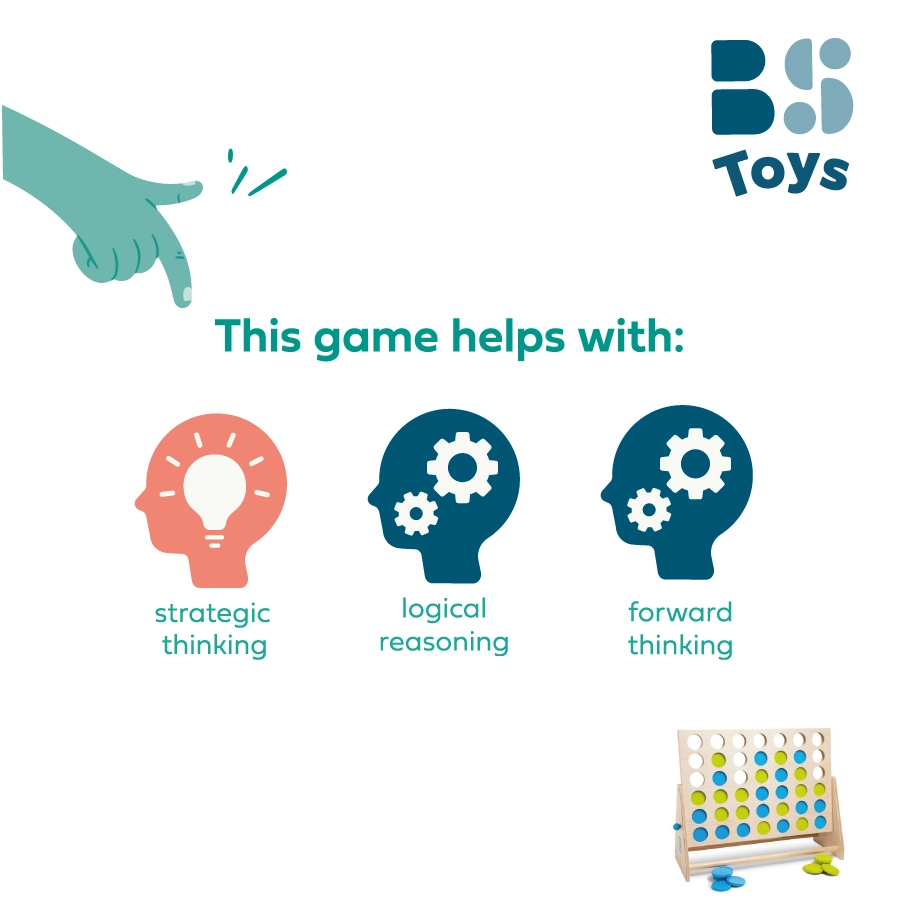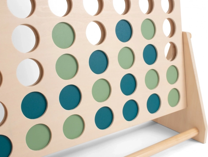 Les joueurs insèrent tour à tour des jetons bleus et verts dans la grille et tentent de créer une ligne de quatre de leur couleur. Ils bloquent en même temps l’adversaire et planifient plusieurs coups à l’avance – un entraînement idéal de la raisonnement logique et de la tactique.