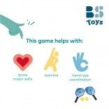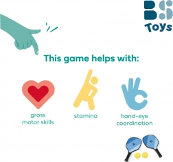 La boîte contient l’équipement complet pour 2 joueurs : 2 raquettes en bois (40 × 19 cm), 2 balles, un filet portable et un sac pour un rangement et un transport faciles. Les règles s’apprennent en un rien de temps et vous pouvez jouer même sur un terrain réduit – par exemple dans une cour d’école ou un gymnase.
