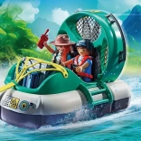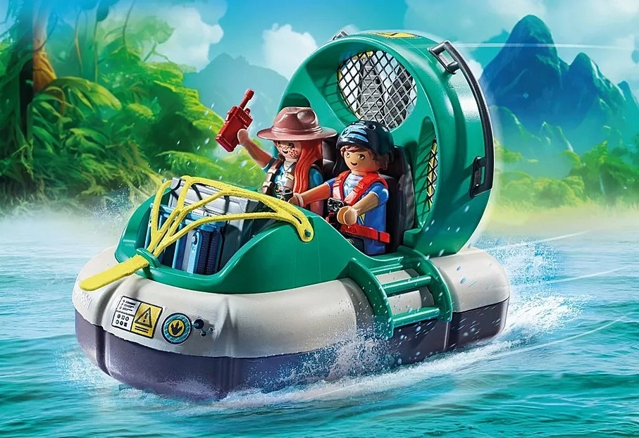 L’aéroglisseur accueille deux figurines PLAYMOBIL et permet des explorations réalistes sur l’eau ainsi que des déplacements rapides à la poursuite des dinosaures.