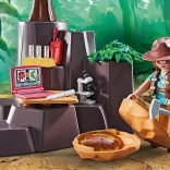 Deux figurines d’explorateurs, une tyrolienne, des outils, un ordinateur portable, des filets, des cordes et des trésors cachés comme une libellule dans l’ambre pour enrichir le jeu.