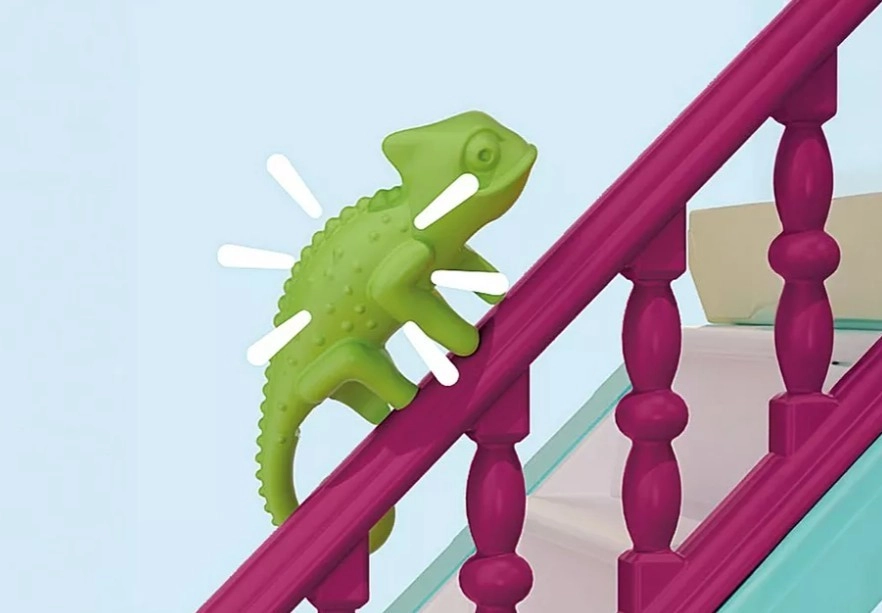 Découvrez la cachette sous l’escalier, une grotte douillette et un adorable caméléon qui s’accroche à la rambarde pour pimenter chaque jeu.