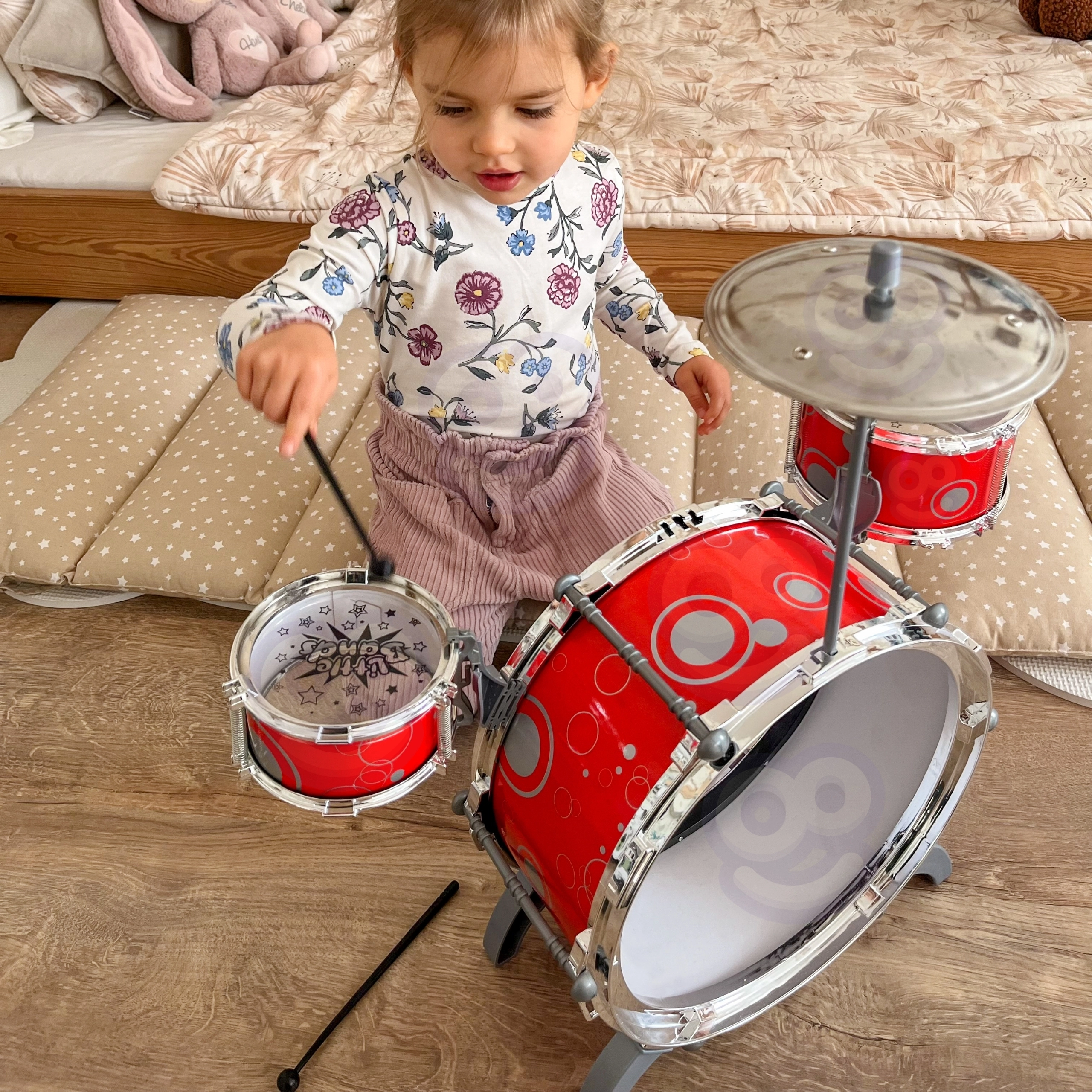 La batterie pour enfants WOOPIE offre une manière ludique et sûre d’initier les enfants à la musique. Ce kit compact comprend une grosse caisse avec pédale, des toms latéraux, une cymbale et des baguettes – le tout conçu pour de petites mains et un jeu confortable. Grâce à un montage simple, elle est prête à l’emploi en un rien de temps.