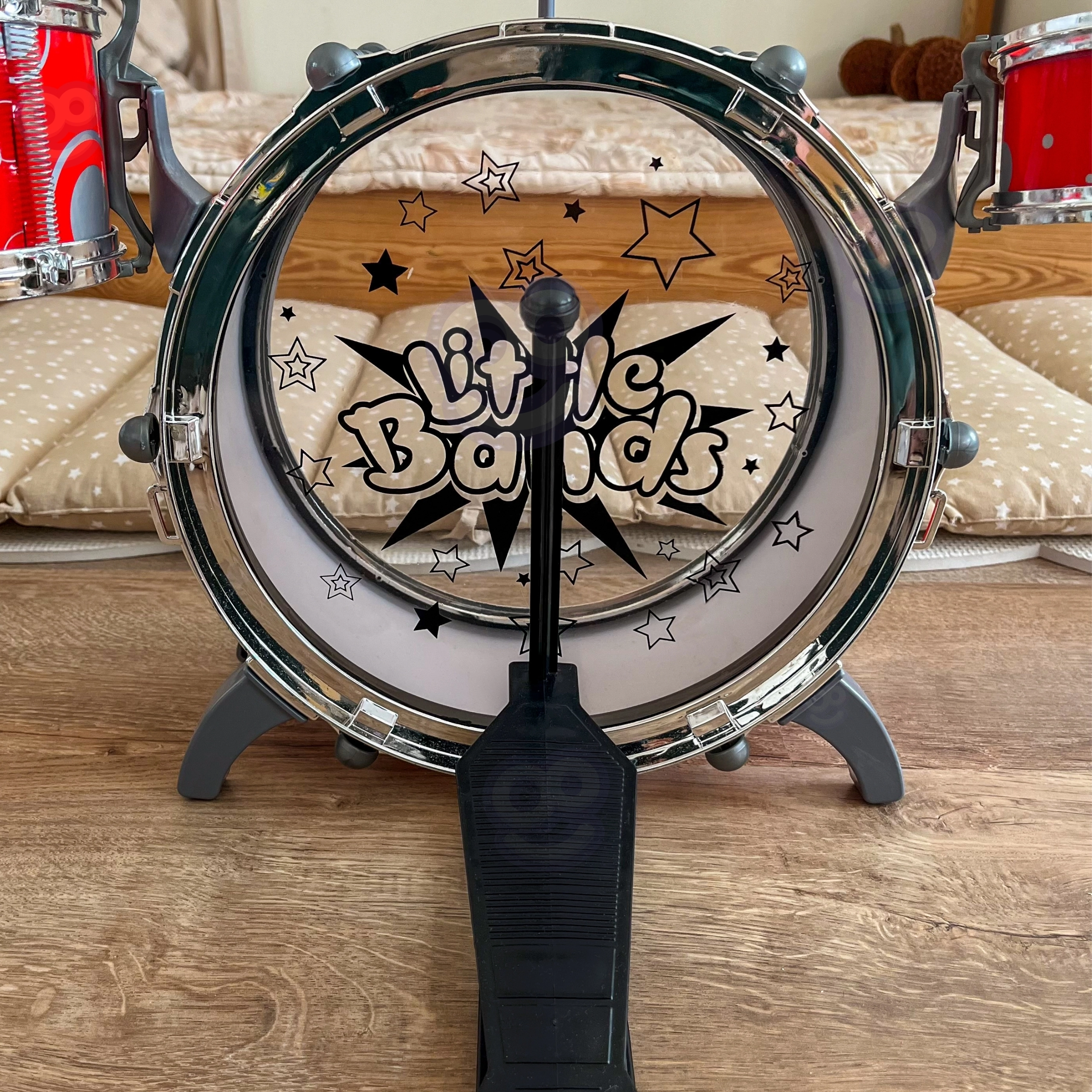 - 1× grosse caisse avec pédale, 2× toms latéraux, 1× cymbale, 2× baguettes, éléments de montage