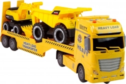 Découvrez un grand set de chantier qui ravira tous les petits fans d’engins de travaux. La dépanneuse avec rampe de chargement mobile charge et décharge facilement les machines incluses. Des gyrophares clignotants réalistes et des sons de moteur, klaxon et sirène activés par boutons rendent le jeu authentique. La pelleteuse possède un bras manuel avec godet et le camion-benne est équipé d’une benne basculante pour « décharger les matériaux ».