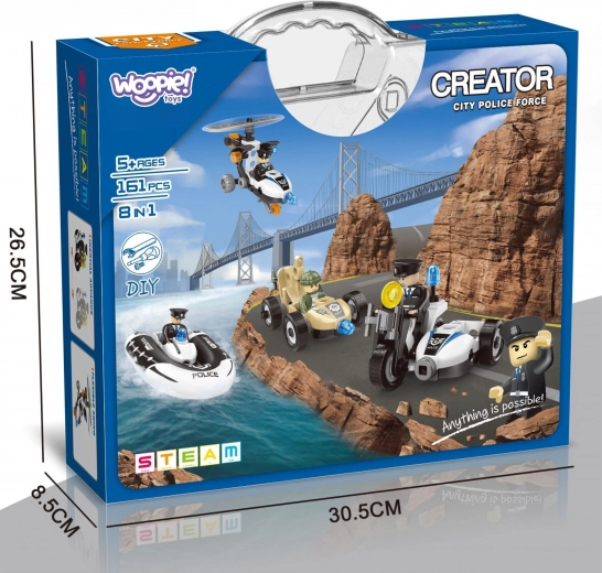 Découvrez l’univers des missions de police avec le kit Woopie Creator City Police Force. Les enfants peuvent assembler eux‑mêmes différents modèles de véhicules tout en apprenant les principes STEAM – une combinaison de créativité, de logique et de pensée technique. Le set comprend également des figurines de policiers pour un jeu encore plus réaliste et des scènes urbaines.