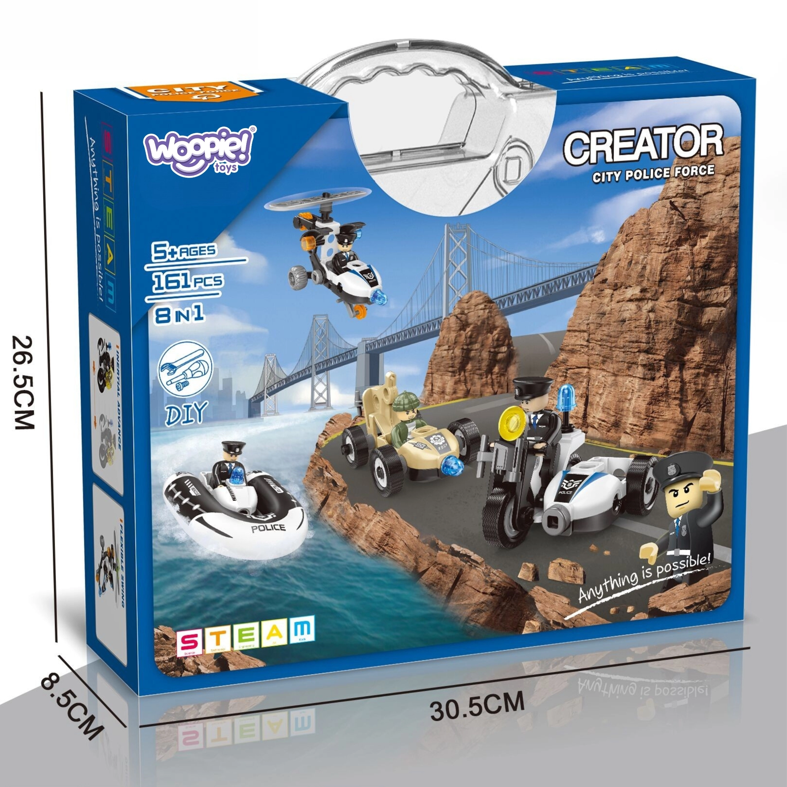 Le kit de construction Woopie Creator City Police Force offre aux enfants dès 6 ans la possibilité d’assembler jusqu’à 8 véhicules de police différents – motos, tout‑terrains, bateaux et quads. Un jouet STEAM à la fois ludique et éducatif qui développe la créativité, la pensée logique et la motricité fine, tout en garantissant des heures de jeu. L’emballage solide avec poignée est idéal pour les voyages et comme cadeau.