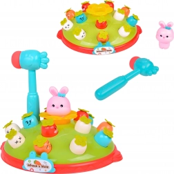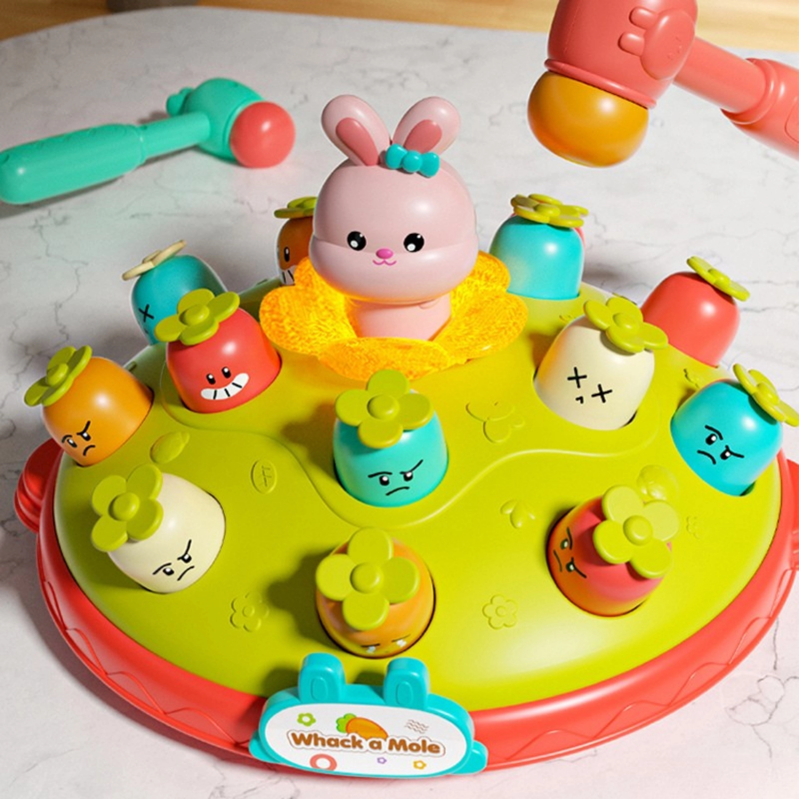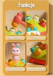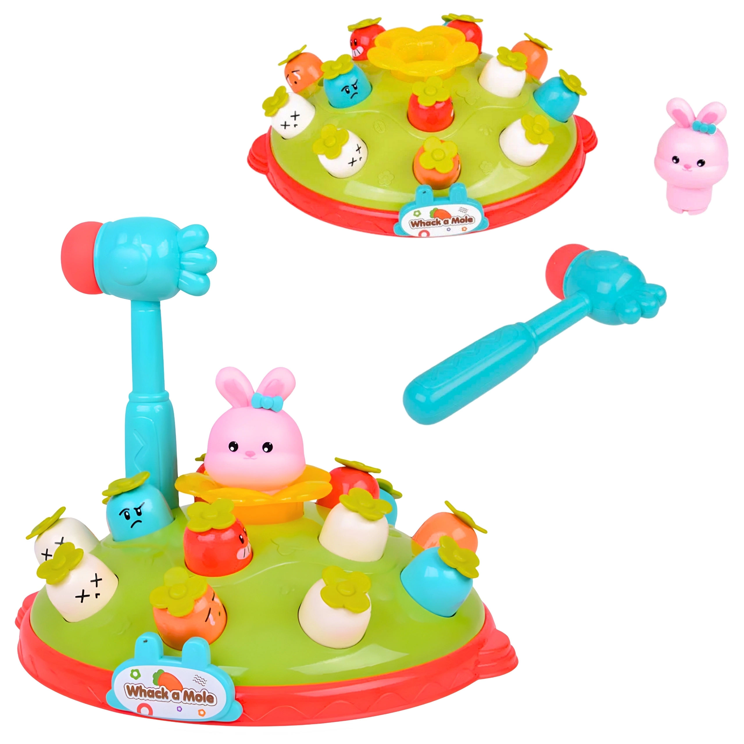 Un jeu interactif amusant et sûr de la marque WOOPIE apporte des heures de joie et d’apprentissage aux enfants dès 18 mois. Les enfants tapent avec un marteau souple sur les « taupes » et améliorent ainsi leurs réflexes, leur coordination œil-main et leur concentration. Des lumières colorées, des mélodies joyeuses et un design amical avec petites carottes et lapinous augmentent la motivation à jouer. Le jeu est fabriqué avec des matériaux de qualité, possède des bords lisses et un marteau souple pour une sécurité maximale des petites mains.
