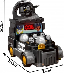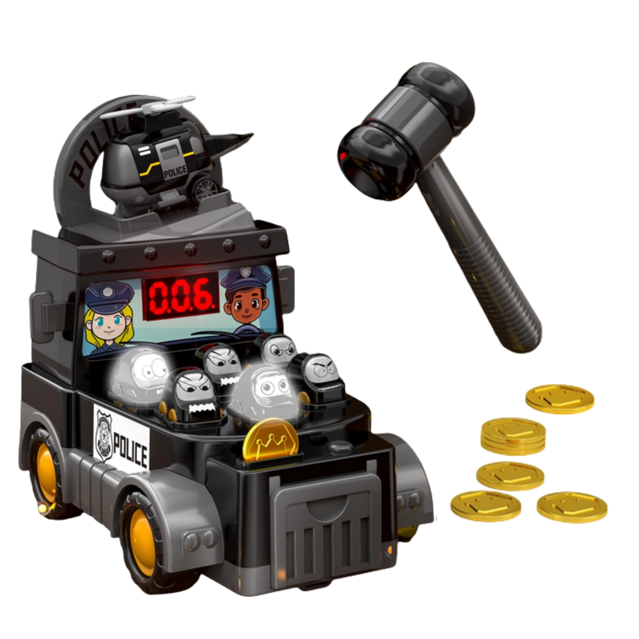 La version policière du jeu populaire Tape la taupe ravira les enfants dès 3 ans. Il suffit de prendre le marteau souple et de viser les «méchants» qui sortent des ouvertures du véhicule radio. Grâce au display de score, les enfants suivent facilement leurs performances et peuvent rivaliser avec leurs amis ou leurs parents.