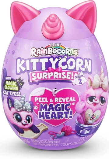 Plongez dans la surprise avec RAINBOCORNS KITTYCORN SURPRISE. À l’intérieur de l’œuf violet se trouve une peluche chaton toute douce avec une corne de licorne, un médaillon en forme de cœur amovible et des accessoires aléatoires qui stimulent l’imagination et le jeu créatif.