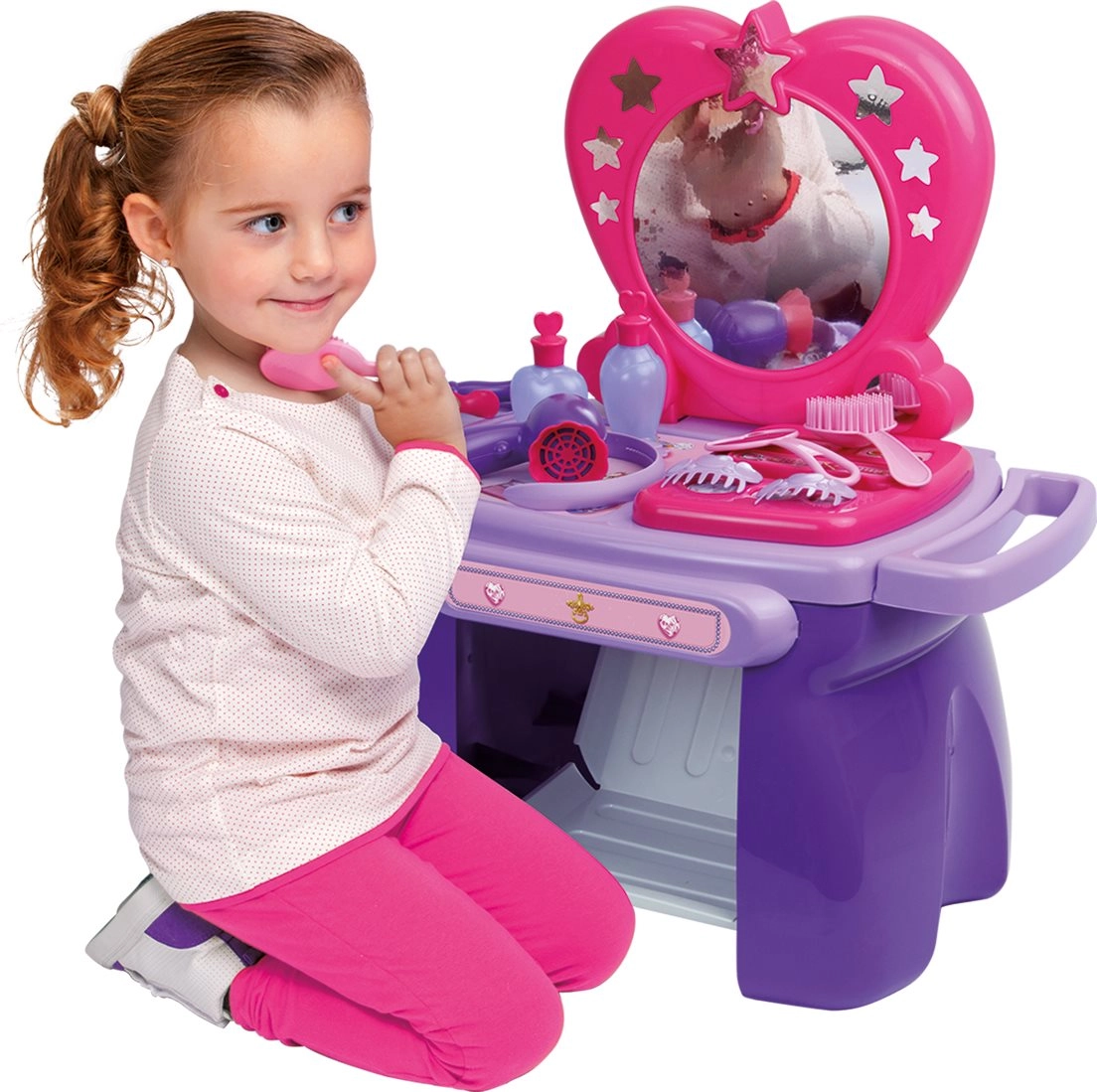 Cette coiffeuse rose et violette avec miroir en forme de cœur et petites étoiles ravira chaque petite princesse et l’invitera à des heures de jeu créatif.