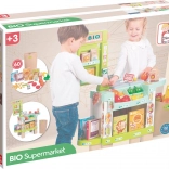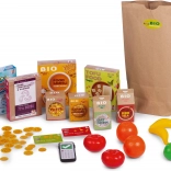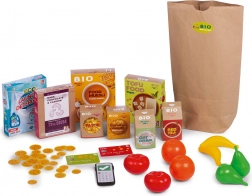 Fruits, boîtes d’aliments, pièces, téléphone et grand sac de courses BIO – tout pour un jeu d’achat complet.