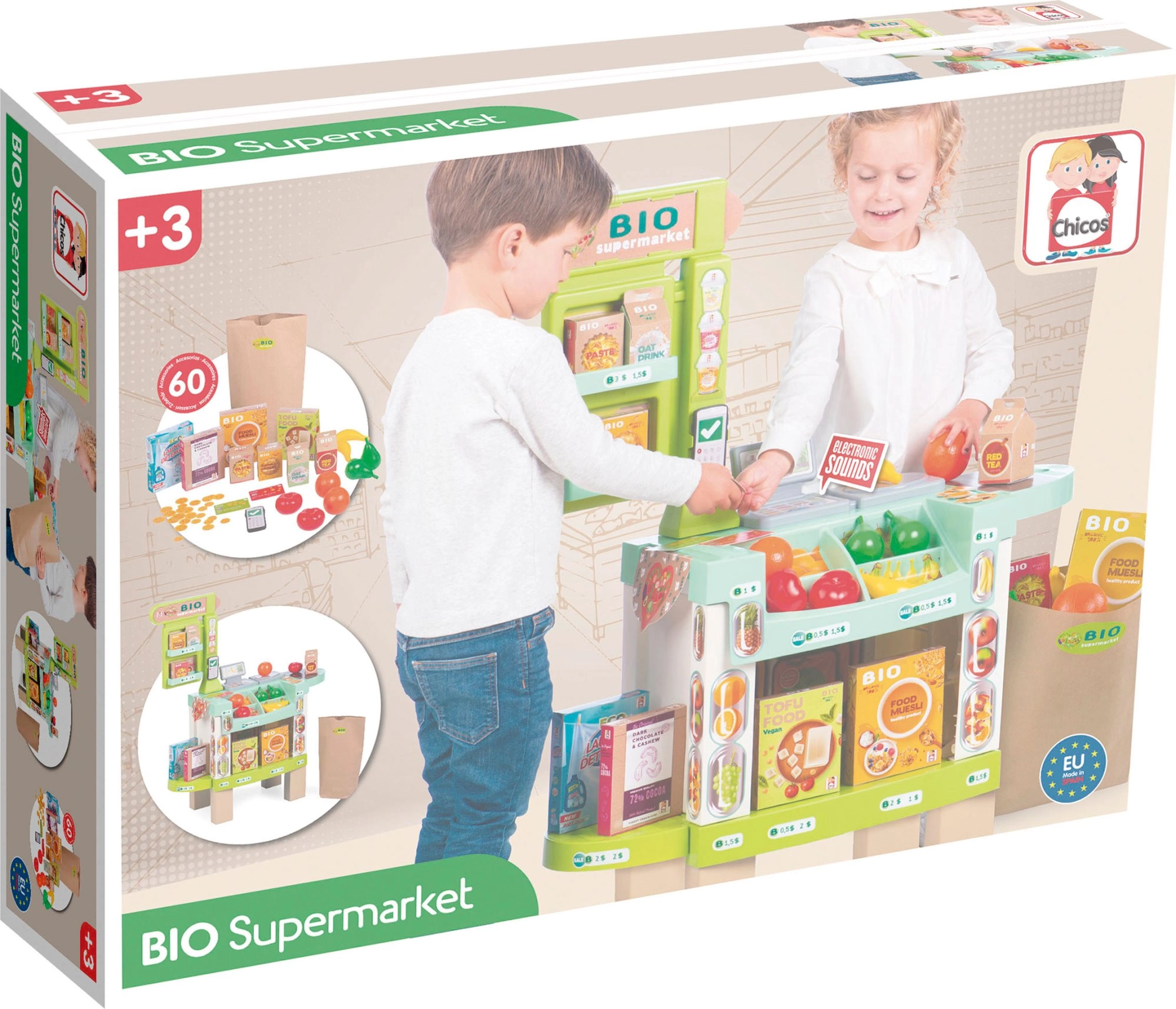 Le supermarché BIO CHICOS pour enfants transforme la chambre en petite boutique où les enfants peuvent essayer les rôles de vendeur et de client. Le riche ensemble de 60 accessoires incluant fruits, boîtes d’aliments, scanner et terminal de paiement favorise le jeu de rôle et le développement de la communication, de la motricité fine et de la pensée logique.