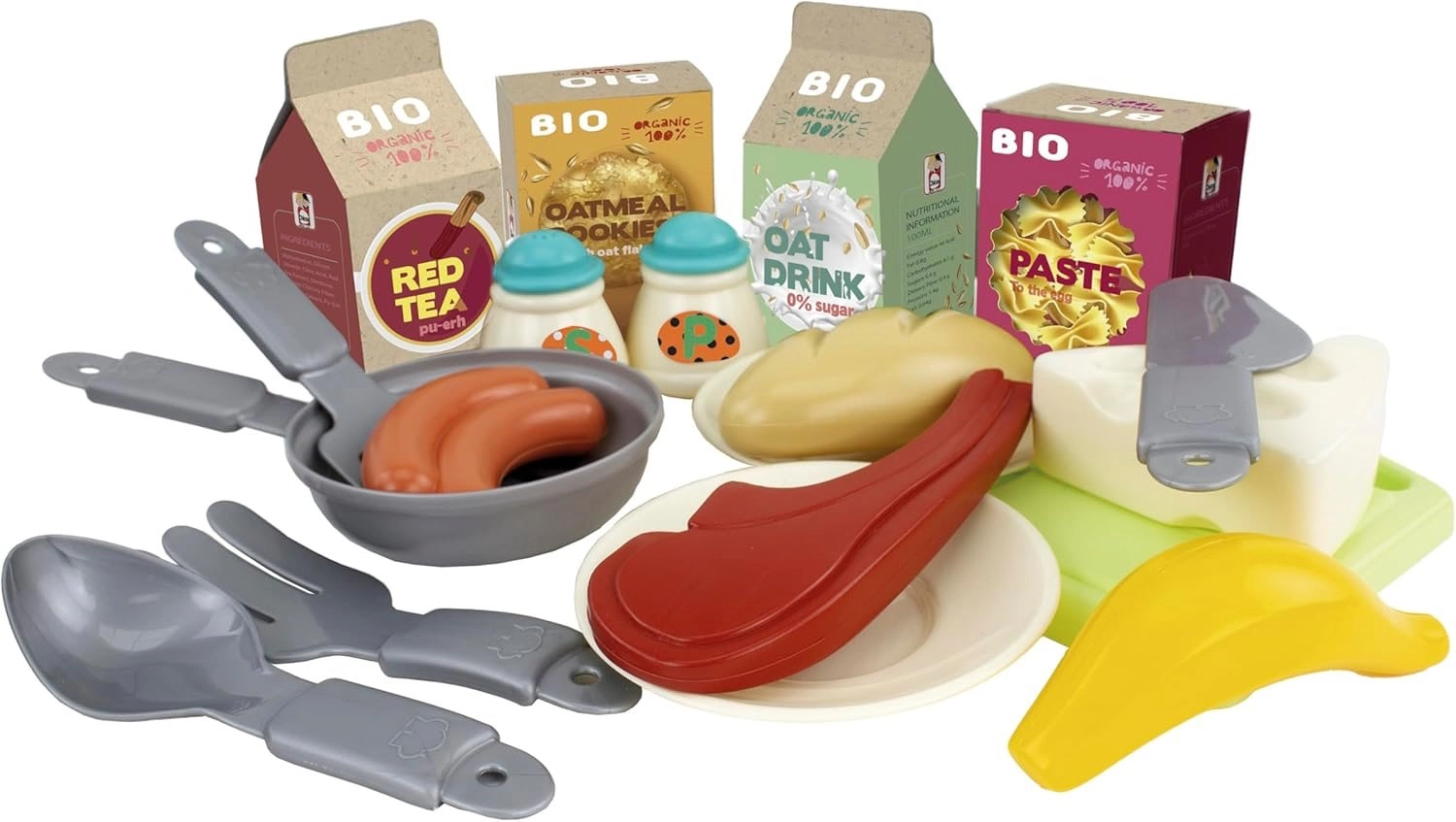 - Set de 19 pièces – poêle, assiettes, couverts, aliments et autres accessoires.