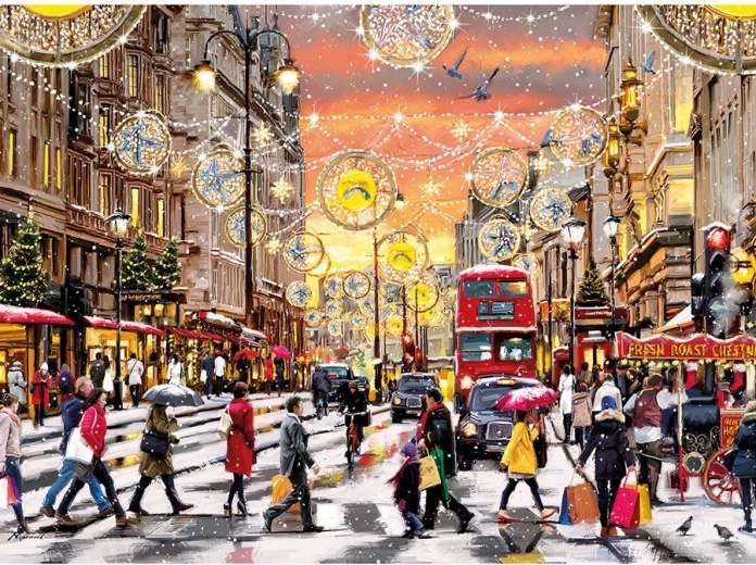 Profitez d’un après-midi d’hiver tout en douceur avec le puzzle de qualité de la marque GIBSONS. L’illustration « Agitation festive » avec 1000 pièces offre une scène de fête riche en détails et, une fois assemblée, mesure environ 68 × 49 cm – un format idéal pour l’encadrement et la décoration intérieure.