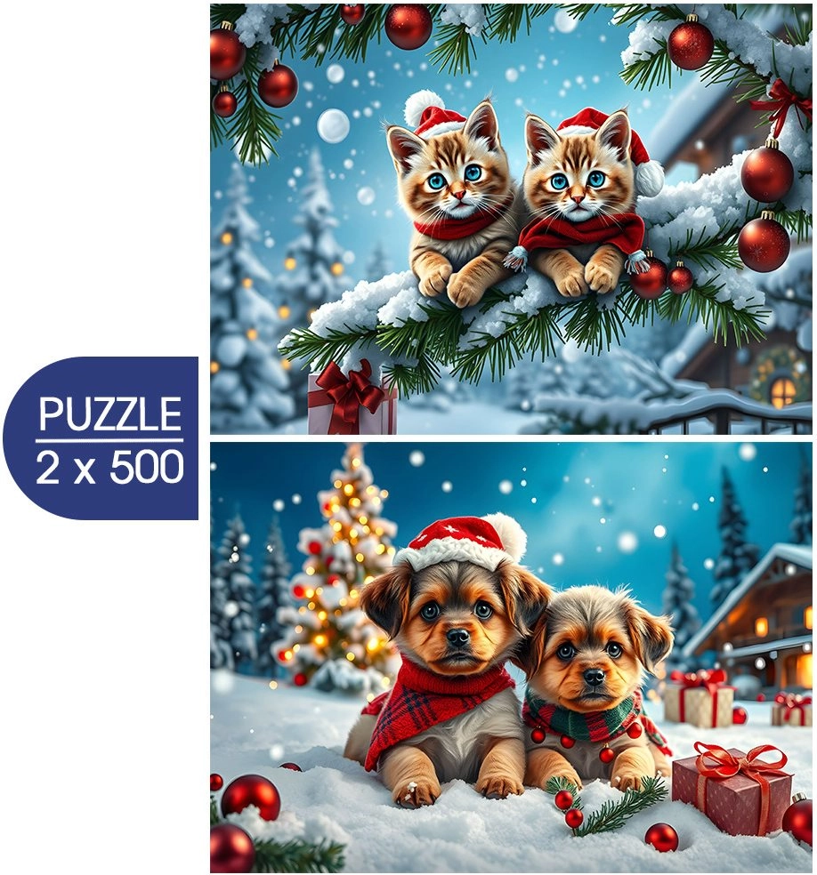 Profitez d’un divertissement festif aux motifs adorables – le coffret comprend deux puzzles de 500 pièces chacun, mettant en scène des chatons et chiots de Noël. Idéal pour des moments paisibles à la maison, développer la patience et pour des séances de puzzle en famille. Une fois assemblé, chaque image mesure environ 47,8 × 34,2 cm.