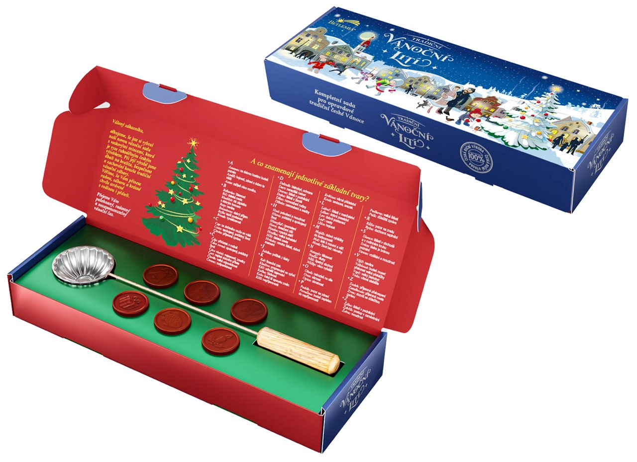 Coffret tchèque traditionnel pour la coulée de cire de Noël, offrant une divination ludique de l’avenir pour toute la famille. Il contient 6 pièces en cire et une louchet d’étreinte pour coulage pratique. Produit tchèque qui perpétue la tradition tchèque et crée une atmosphère festive.