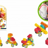 Les blocs sont flexibles – vous pouvez les plier, ils reprennent toujours leur forme initiale. Les différentes tailles d’éléments et de roues invitent à construire des tours, des petites voitures et des créations imaginaires. Le sac à dos transparent sert d’emballage et d’espace de rangement, ce qui permet d’emporter facilement l’ensemble au parc, chez les grands-parents ou en vacances.