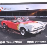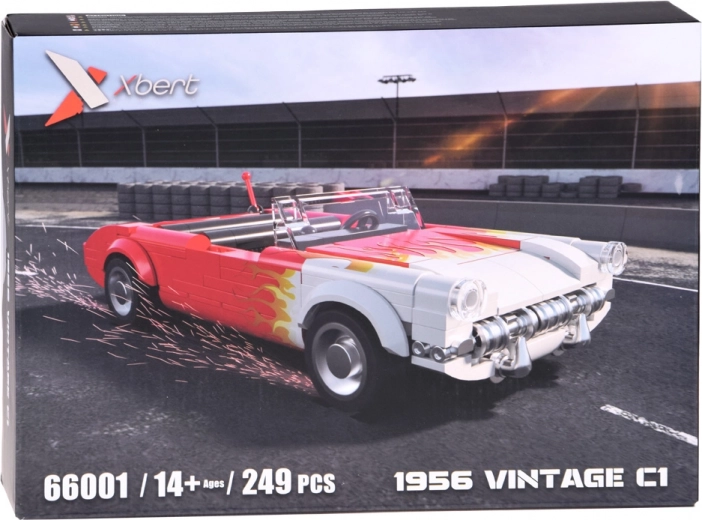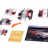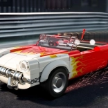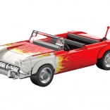 Roadster rouge et blanc avec flammes, cockpit ouvert et calandre détaillée, il restitue l’atmosphère des voitures américaines classiques des années 50.