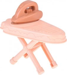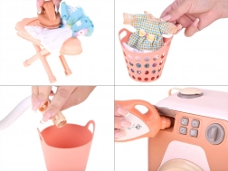 Sont inclus: paniers, flacons de “détergents”, fer avec planche à repasser, portemanteau et un lot de cintres ainsi que des vêtements pour poupées – tout pour laver, étendre et repasser.