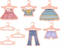 Planche à repasser, fer, pulvérisateur, portemanteau/râtelier à cintres, 3× cintre, 2× cintre pour jupe, 1× cintre pour short, 1× cintre pour pantalon, 1× cintre pour t-shirt, 2× panier à linge, 2× flacon de “détergent”, 2× robes pour poupées, planche d’autocollants